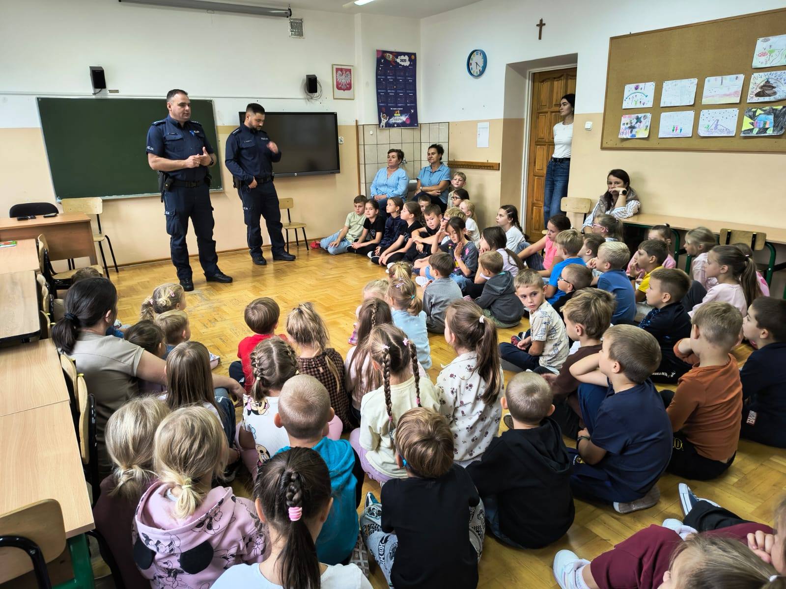 W dniu dzisiejszym dzieci z przedszkola, klasy zerowej oraz klas I-III na spotkaniu z policjantami dowiedziały się jakie są zasady bezpiecznego poruszania się po drodze publicznej, że mają unikać obcych, jak obronić się przed atakiem psa, a razie konieczności – pod jaki numer zadzwonić, żeby wezwać pomoc
